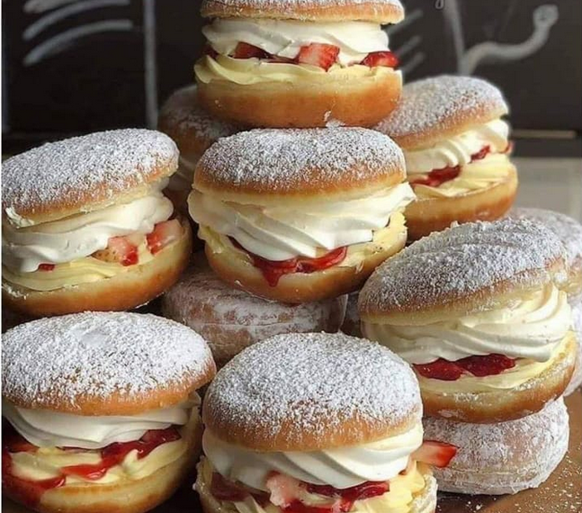 Aplatissez un peu chaque boule et roulez-la à nouveau en boule. Couvrir et laisser reposer encore 30 minutes. Frire les boules dans l’huile chaude à feu doux pendant 2-3 minutes de chaque côté. Laisser refroidir un peu et couper en deux dans le sens de la longueur, comme un pain à burger. Garnir une moitié de chantilly et de fraises hachées, refermer avec l’autre moitié, saupoudrer de sucre glace et servir.