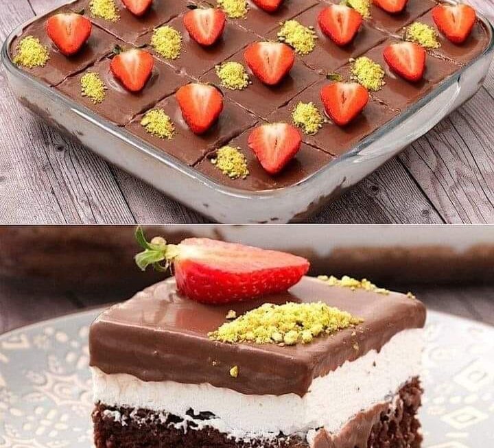 Réfrigérer le gâteau pendant 2 heures. Garnir de pistaches et de fraises