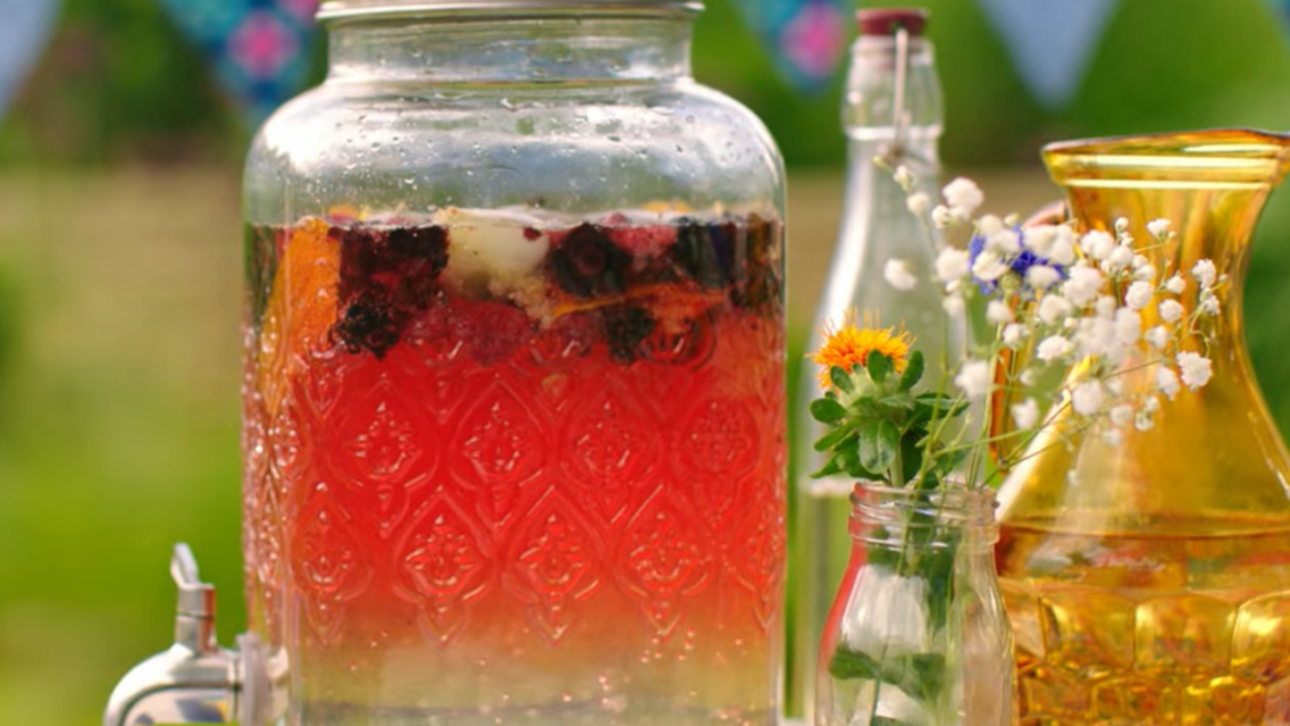 - dans une grande carafe: mettre les mûres coupées en 2 pour donner une belle couleur violette à la boisson, les framboises, le thym et les zeste du citron. Ajouter ensuite les glaçons, le jus de fleur de sureau et ensuite l’eau gazeuse