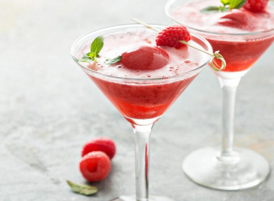 - Servir la boisson dans des verres à cocktail, décorer avec quelques framboises et quelques feuilles de menthe. Si vous avez préparé ce Cocktail en avance, placez le pichet au frigidaire pour servir plus tard l’apéritif bien frais.