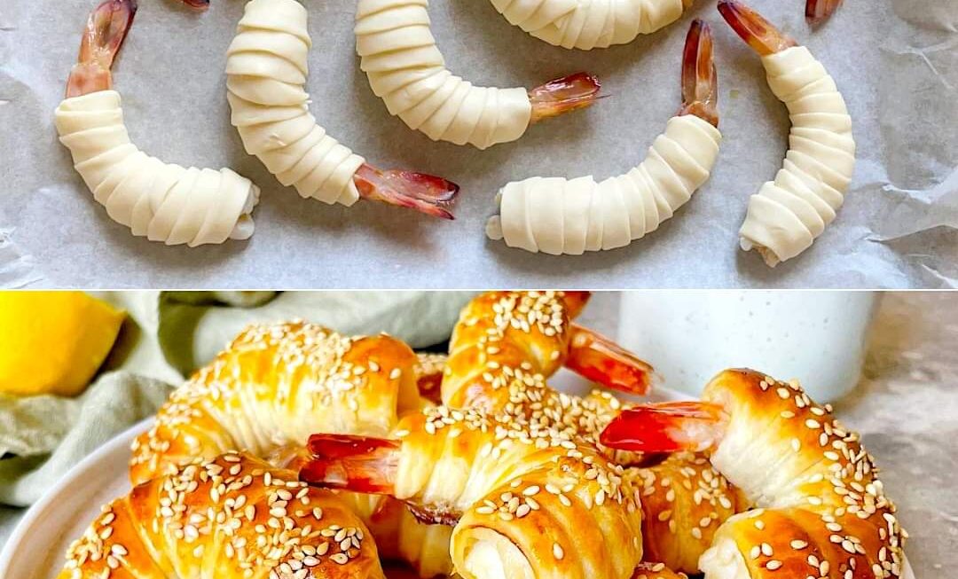 Découper de fines lanières dans la pâte feuilletée et en entourer les crevettes. Déposer sur la plaque du four le temps que la pâte lève. Se régaler !