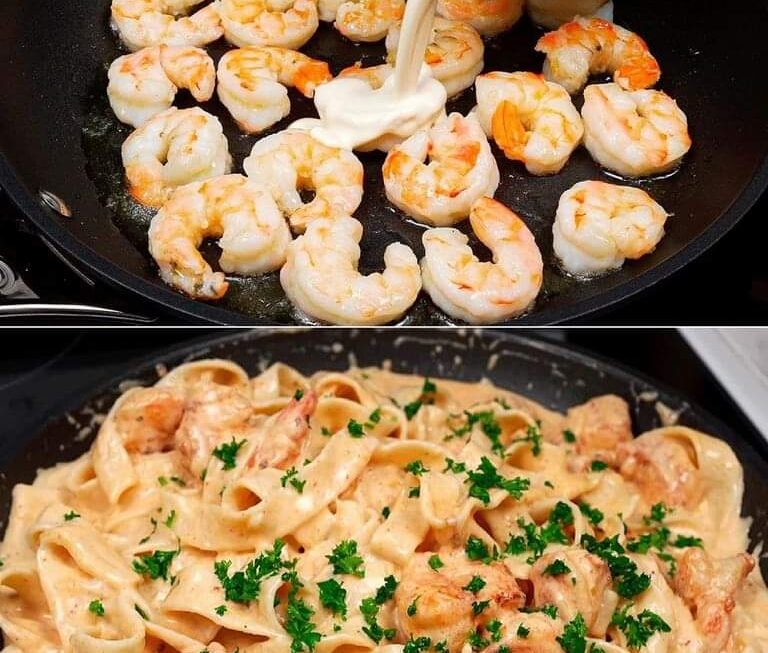 6. Ajoutez maintenant les pâtes et les crevettes en mélangeant jusqu’à ce que les pâtes soient complètement recouvertes de sauce. Au moment de servir, décorez avec le persil haché et vous pouvez ajouter un peu plus de parmesan.
