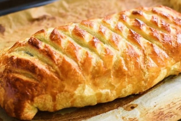 Épinards et fromage – ils agissent de la même manière que les duxelles de champignons dans le bœuf Wellington et créent une barrière entre le saumon et la pâtisserie.