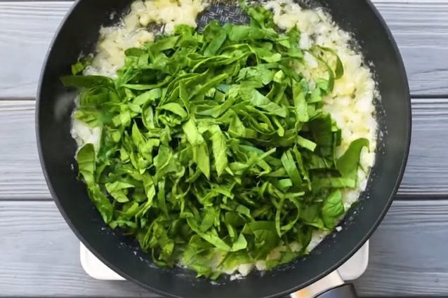 Ajouter les épinards, le sel et le poivre et cuire jusqu’à ce qu’ils soient fanés.