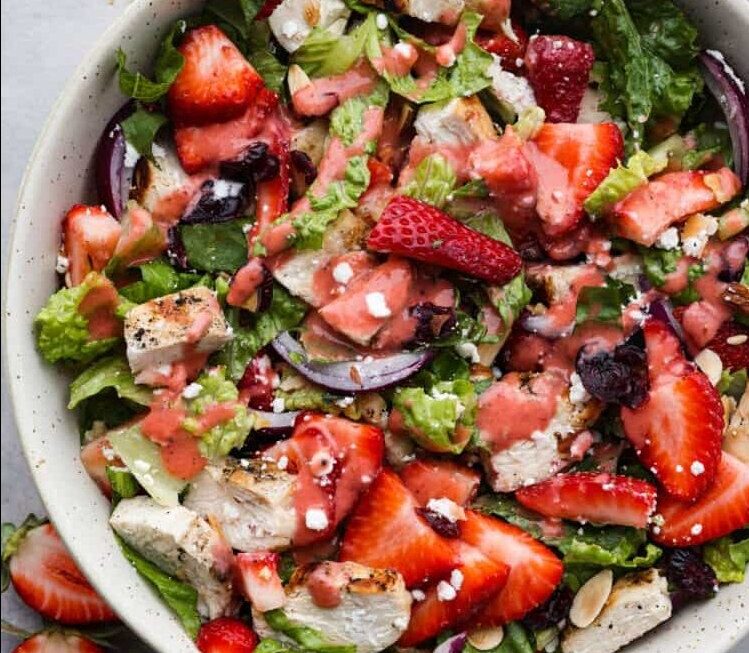 Dans un grand saladier, combinez la laitue romaine, les poitrines de poulet tranchées, les fraises, les amandes, le fromage feta et l’oignon rouge.