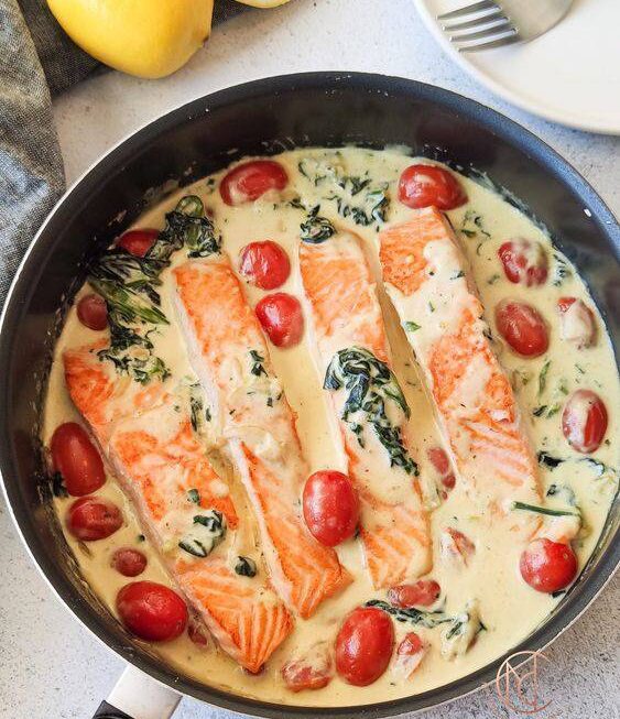 Un saumon cuisiné à la sauce toscane à base d’ail, parmesan, épinards et tomates. Une recette simple et rapide.