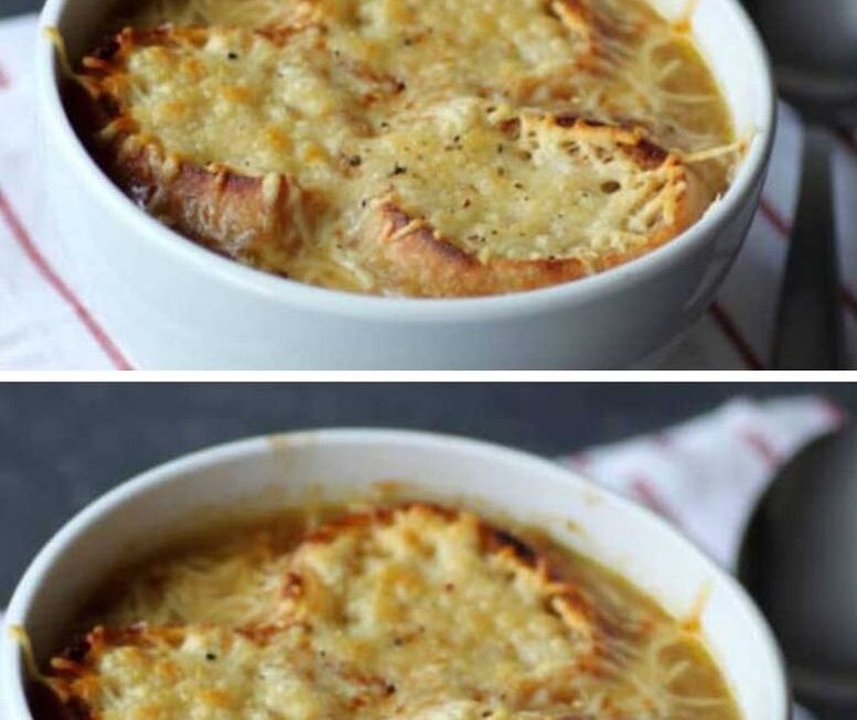 Versez la soupe très chaude dans des bols ou des assiettes de service, posez dessus les tranches de pain, répartissez le fromage râpé,