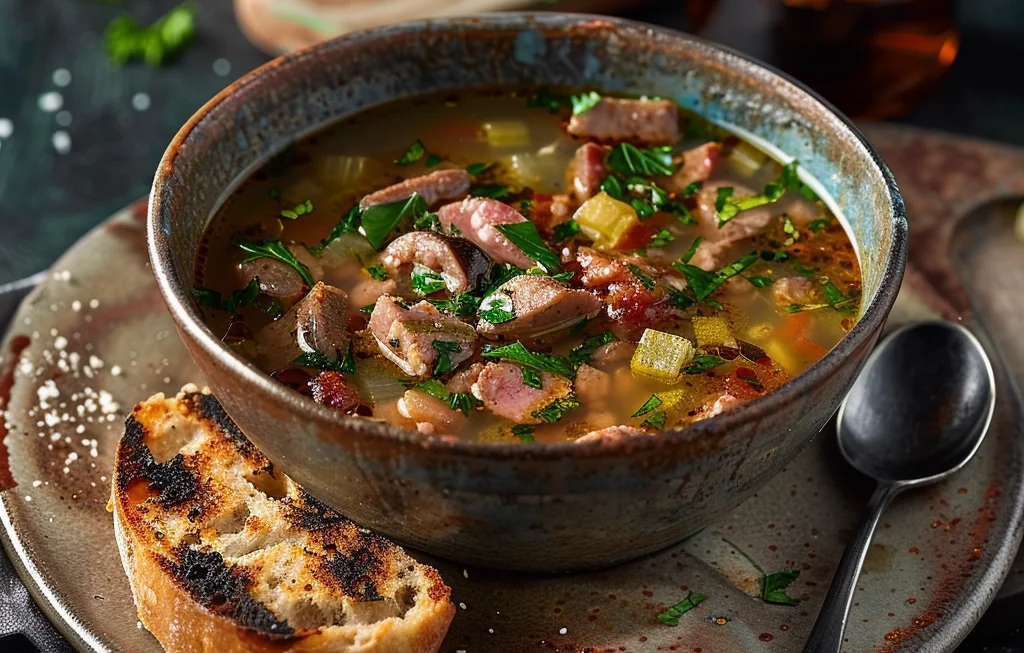 Etape8 : Retirez le bouquet garni et parsemez de persil. Salez et poivrez à votre convenance. Versez la soupe dans quatre bols et servez aussitôt.